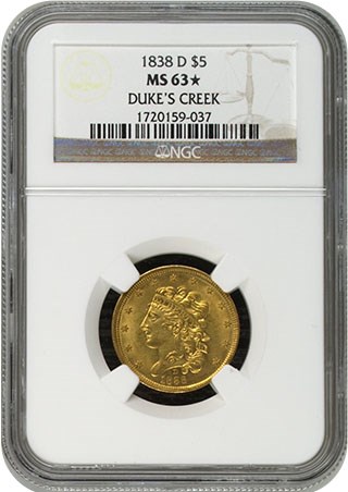 - 1838-D $5, graded NGC MS 63★ (Finest Graded)